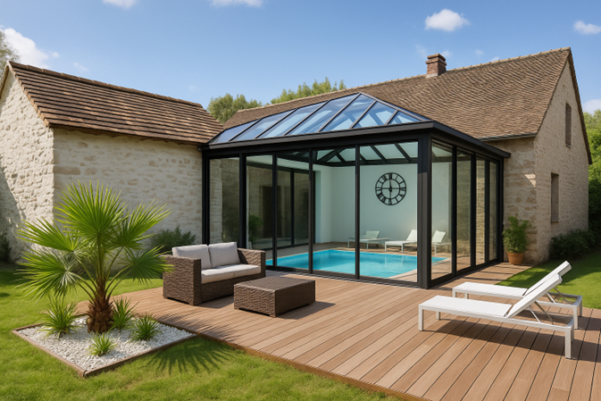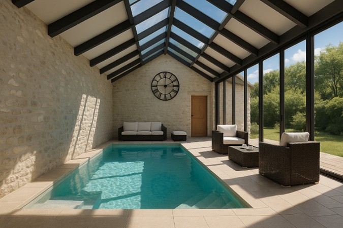Une piscine couverte, chauffée par pompe à chaleur, complète cette rénovation durable et adaptée aux besoins des habitants.